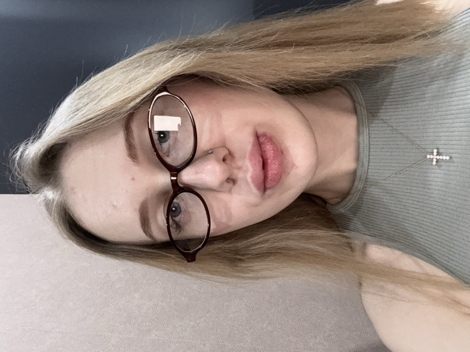 The image depicts a close-up portrait of a young Caucasian female in an indoor setting within the city of Azov, Russia