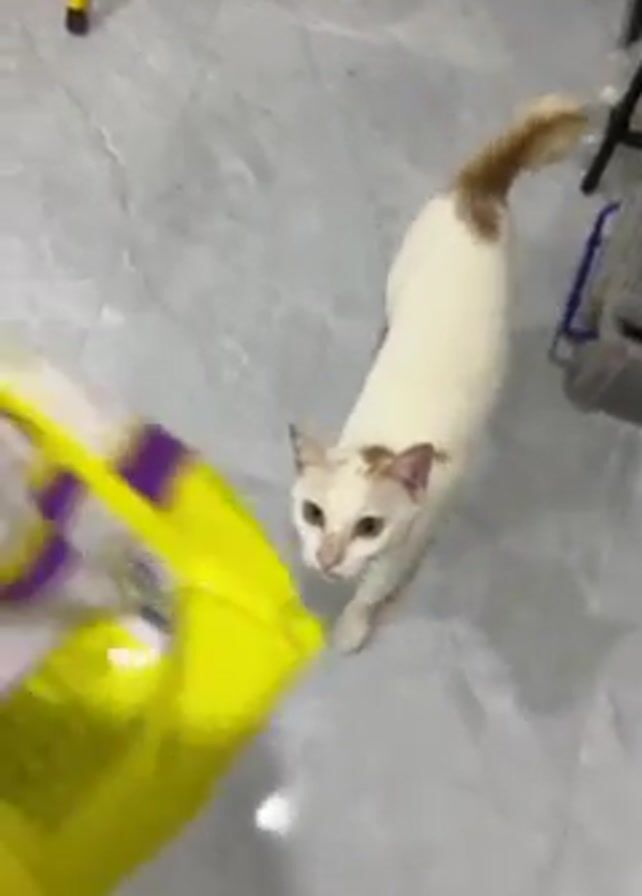 A white cat with brown markings is seen in a short video clip. The cat is standing on a gray tiled floor in what appears to be an indoor setting. A hand holds a yellow and purple bag of cat treats in front of the cat, rustling the bag. The cat meows and looks up at the bag expectantly. A yellow stool and a small black wire structure can be seen in the background.