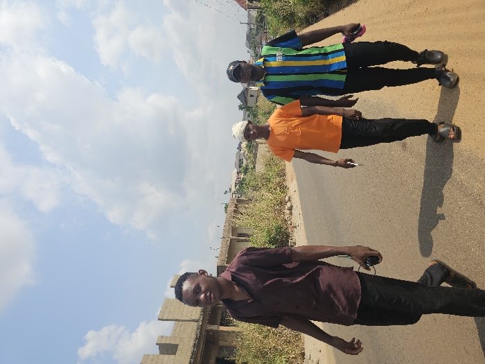 Three adult males walk from left to right on a paved road in Ukwu-Abwa, Nigeria