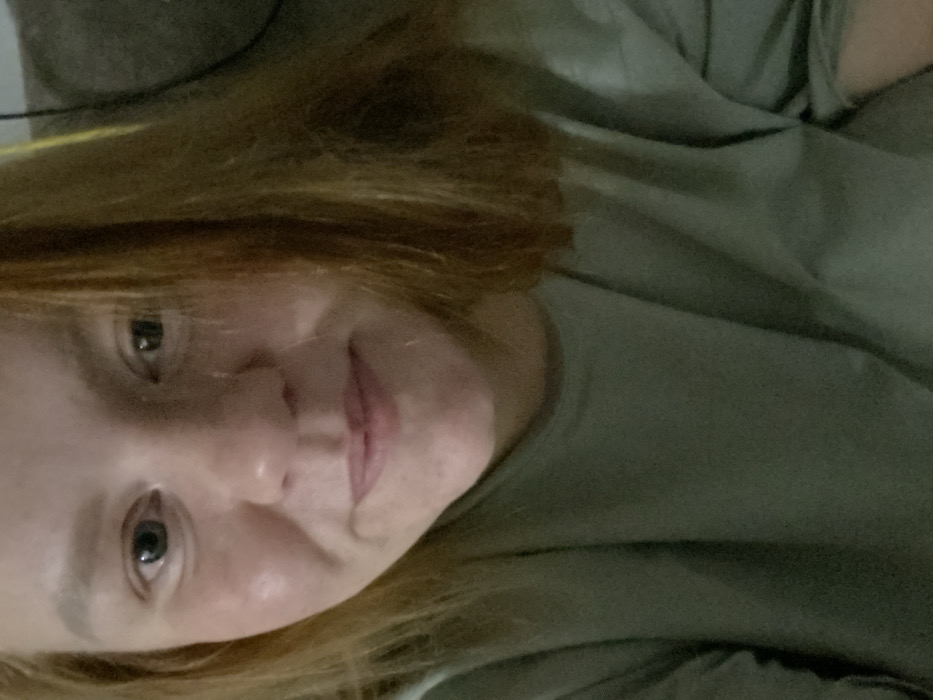 A woman with reddish-brown hair is lying down