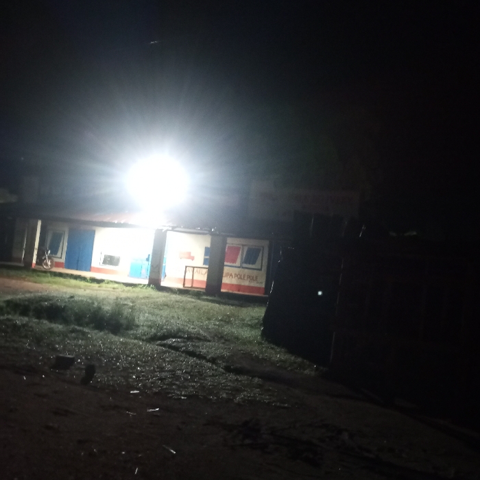 At night, a building is brightly lit by a spotlight, creating a stark contrast against the dark surroundings. The building has blue and red accents and a sign that says "AILA UPA POLE POLE". In front of the building, there is grass or vegetation that appears to be wet or dewy. To the right, a darker, undefined structure stands. The ground is uneven and looks like a dirt road or pathway.