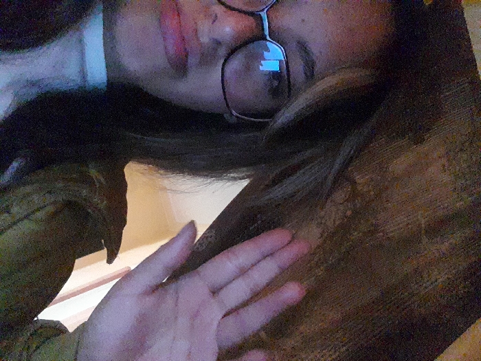 The image displays a young female subject captured in a close-up, upward-angled shot. She occupies the left and central portion of the frame, wearing dark-rimmed eyeglasses that reflect blue light. Her long, dark hair features lighter streaks near her face, which is partially visible from the left side. Her lips are slightly parted. She is dressed in a light-colored top, beneath a brown or tan outer garment with a distinct, textured collar or lapel visible over her right shoulder. Her left hand is raised, palm facing forward, with fingers slightly splayed. The upper part of the frame is dominated by a dark, coarse, and horizontally oriented textured surface, possibly wood. The background, visible behind the subject's right side, consists of a plain, light-colored wall with a faint vertical line, indicative of an indoor environment. No specific visual elements are present to identify a location within the city of Meknes, Morocco.