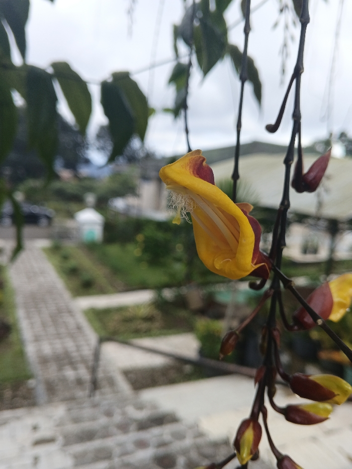 A vibrant yellow flower with a reddish-brown accent hangs gracefully from a thin, dark stem. Several unopened buds, also tipped with yellow and brown, dangle nearby. The backdrop is a soft blur of greenery, stone steps, and a pathway leading to distant structures, suggesting a garden or park setting under an overcast sky. The image focuses primarily on the intricate details of the flower, capturing its unique shape and texture.