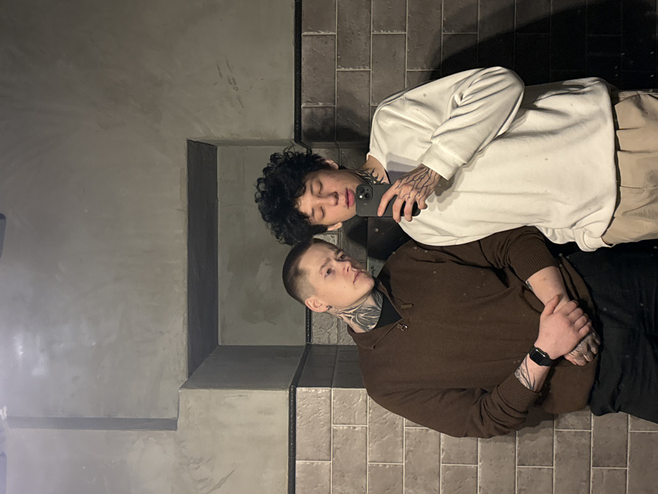 The image displays two males, reflected in a mirror, inside an indoor setting. The male on the left has short-cropped hair, extensive dark tattoos on his neck and forearms, and wears a dark brown collared sweater over a black shirt, paired with dark trousers. A black smartwatch is visible on his left wrist. He stands with hands clasped in front, looking towards the camera with a slight head tilt. The male on the right has dark, curly hair, and dark tattoos visible on his neck and right hand. He wears a white long-sleeved crewneck sweatshirt, with minor dark smudges, and light-colored trousers. He holds a black smartphone with a prominent multi-lens camera array in his right hand, angled to capture the reflection, indicating he is taking a selfie. His eyes are directed downwards, and his left hand is in his pocket. The background behind the subjects consists of a lower section of light brown rectangular tiles with dark grout, topped by a dark horizontal trim line. Above this trim, the wall is a smooth, matte light grey texture, possibly concrete or plaster, featuring subtle darker lines forming geometric patterns. The lighting suggests an indoor environment. The precise location within Saratov, Russia, cannot be determined from the visual information presented in the image.