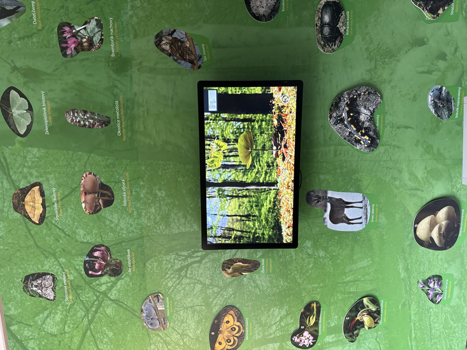 The scene depicts an indoor educational wall display located in Vavřinec, Czechia
