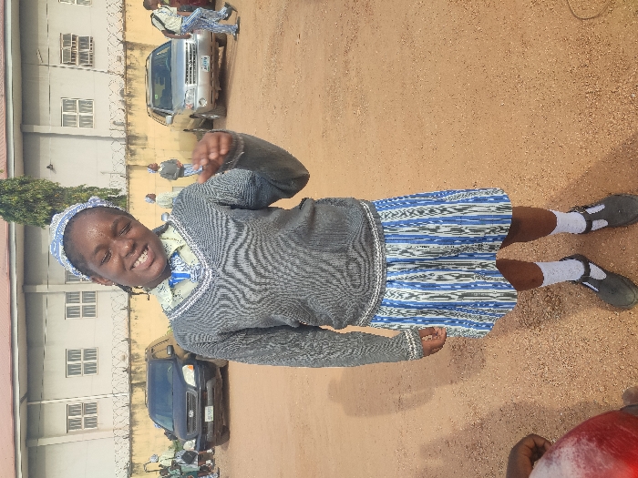 The image portrays a young female standing on a reddish-brown dirt ground in an outdoor setting, identified as a location in Barden Yana, Nigeria. The subject, a person of color, faces the viewer directly, smiling broadly with her head tilted slightly to the left. She is dressed in a grey V-neck sweater with patterned trim, layered over a light-colored collared shirt with a blue and white patterned tie. A matching blue and white patterned headband is worn on her head. Her lower attire consists of a blue and white patterned pleated skirt that reaches above the knee, white ankle socks, and black Mary Jane style shoes. Her right arm is raised slightly, with her hand open and fingers splayed. In the background, a light-colored, multi-story building with multiple rectangular windows and a dark roof is visible behind a low wall topped with what appears to be barbed or razor wire. A tall, slender green tree stands in front of the building towards the center-right. Two SUVs are parked: a black one on the left and a silver one on the right. Several other individuals, primarily youths in what appear to be school uniforms (some displaying blue and white patterns), are scattered in the mid and far background, either standing or walking. The sky is a light, clear blue. The overall environment suggests a school or educational institution's outdoor campus.
