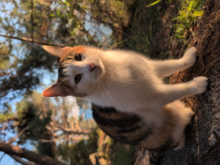 - "A domestic calico cat, featuring white fur with distinct brown-tabby and orange patches, is depicted seated on the ground" by FM-5itlR2, licensed under CC BY 4.0