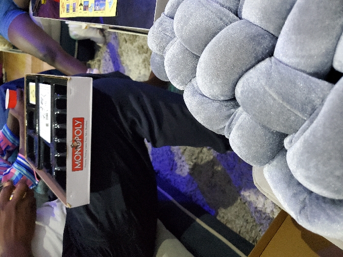 A Monopoly board game sits next to a soft, braided pillow. The game, partially visible, reveals its storage compartments, with "MONOPOLY" prominently displayed on its side. A person, seen holding a small red cup, is partially visible to the left. The background includes a rug with blue and gray hues, and what appears to be a table or desk with other items, adding to the indoor setting.