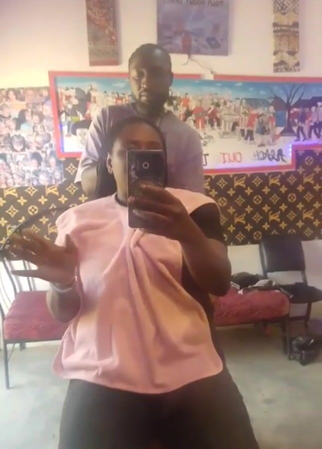 A person wearing a pink cape sits in a salon chair, taking a selfie video. A man stands behind them, attending to their hair. The salon has walls decorated with various pictures and decorative patterns. There are other chairs and items visible in the background. The lighting is bright and even. The person in the chair is smiling and waving at the camera.