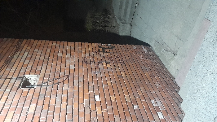 The scene, located in Svishtov, Bulgaria, depicts an exterior corner under low light, likely at night. A prominent reddish-brown brick wall occupies the left side of the frame, featuring horizontally laid bricks. Approximately one-quarter down from the top, an exposed rectangular cavity in the wall contains multiple intertwined electrical or communication cables, primarily white and black. Below this opening, dark, indistinct graffiti or scrawled markings are present on the brick surface. Scattered white discoloration and minor damage are visible across the brickwork. The foreground consists of light grey concrete steps, bordered by a narrow reddish-brown strip at the leading edge. These steps ascend to a concrete landing that meets the base of the brick wall. To the right of the brick wall, a deep shadow obscures the background, revealing the upper portion of a second set of concrete steps and a small, bare shrub. No individuals are visible. The primary illumination source appears to be from the left, casting a sharp shadow line along the right edge of the brick wall and obscuring details beyond.