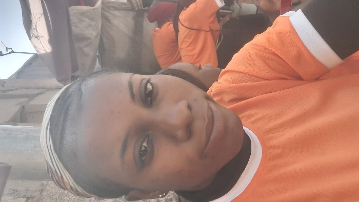 The image presents a close-up, front-facing view of a dark-skinned individual, identified as female, situated in an outdoor urban setting in Zango, Nigeria
