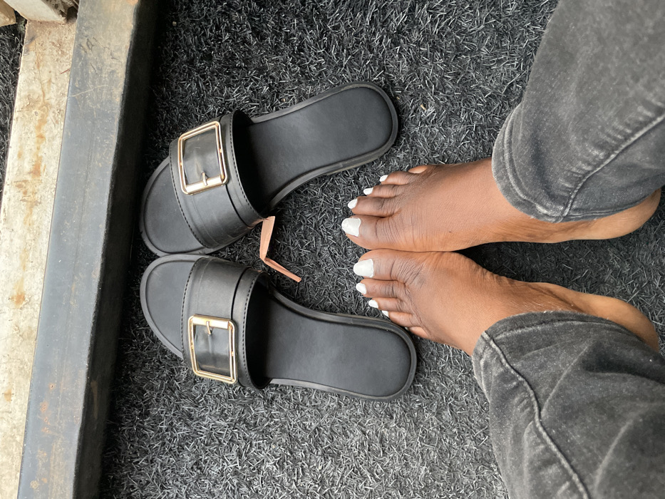A downward-angle, first-person view displays a pair of dark-skinned bare feet with all ten toenails painted white. The feet are positioned on a dark grey, shaggy carpet or mat, with the lower portions of the legs partially visible in dark grey denim jeans. Directly in front of the feet, a pair of black women's slide sandals with prominent gold-colored rectangular buckles are situated, parallel to each other and facing away from the viewer. A light brown tag is discernible between the sandals. In the upper background, an elevated, horizontal dark metallic beam or railing, exhibiting signs of wear and possibly rust, runs across the frame. Behind this beam, a rough, lighter-colored surface, possibly concrete or stone, is partially visible. The specific location in Jos, Nigeria, cannot be determined from the visual information provided.
