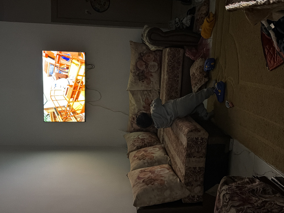 The image depicts an indoor living space, identified as being in Dar Bouazza, Morocco. The scene is dimly lit. A young child, viewed from behind, stands in the center-right of the frame, facing a wall-mounted flat-screen television. The child is wearing a light grey hooded tracksuit and blue shoes, with dark, curly hair. The child's arms are bent at the elbows, and hands are held in front of the torso. The child appears to be standing against or near a large, L-shaped sectional sofa. The sofa is upholstered in a patterned fabric featuring brown, beige, and red/pink floral or intricate designs, with a dark wooden base. Multiple cushions with matching patterns are visible on the sofa. The television screen displays an animated scene featuring a character in a white suit within an orange metal structure, possibly a lift or scaffolding. Black wires hang from the bottom of the television. The floor in the foreground and midground is covered by a light brown carpet/rug, beneath which white tile flooring is visible, particularly near the sofa. Scattered on the carpet are several objects, including a blue child's shoe (possibly a Croc-style sandal), another blue object (possibly a toy), a small light-colored object, a red/pink fabric item, and a yellow fabric item. A dark red quilted fabric item with additional clothing is present in the bottom right corner of the carpet. Further fabric items are piled near the right armrest of the sofa. On the right side of the image, a dark brown door is partially visible, appearing slightly ajar. A circular decorative object is mounted on the wall above the partially visible door. The walls are a light, uniform color.