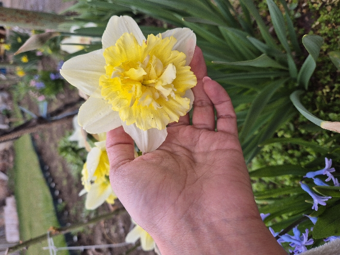 A human hand, consistent with an adult's and exhibiting a light brown skin tone, holds a bicolored daffodil flower in an outdoor garden setting in Staroseltsi, Bulgaria. The daffodil displays six white outer perianth segments and a prominent, ruffled, double-layered yellow-to-pale-yellow corona. The hand supports the flower from below, with portions of the thumb and index finger visible on the left side of the flower. In the lower-left foreground, several clusters of blue-purple grape hyacinths are visible amongst green foliage. The background consists of a verdant garden environment, featuring other daffodil plants, green grass, bare soil patches, and indistinct colorful flowers (pink, yellow) further in the distance. Vertical wooden or metal stakes and a white support structure are present in the mid-ground. Natural light illuminates the scene.