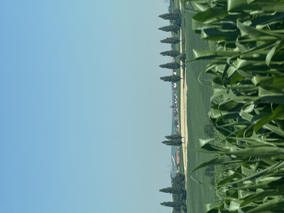 A rural landscape unfolds under a clear, light blue sky. Fields stretch across the scene, with tall corn stalks in the foreground. A line of trees marks a boundary, beyond which lies a lighter-colored field, potentially wheat or hay. Small houses and buildings, possibly a village, dot the horizon. Power lines are visible in the distance, adding to the rural atmosphere. The scene is rotated, giving an unusual perspective.