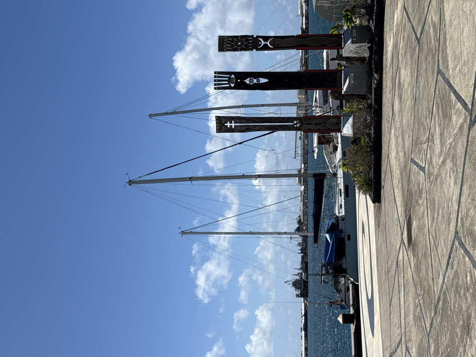 The image depicts a waterfront scene in Papeete, France, under a clear blue sky with scattered white clouds. In the foreground, a paved concrete ground with geometric dark-lined patterns is visible, featuring a large, lighter-colored spiral design to the left. On the right, a raised, dark-colored planter contains low-lying green foliage. Within or behind this planter stand three tall, dark wooden carved pillars, resembling totem poles, each mounted on a grey base. The leftmost pillar displays a white cross-like symbol at its apex and intricate carvings below. The central pillar features a prominent stylized eye at the top, with vertical lines and abstract symbols. The rightmost pillar includes a crescent moon symbol at its peak and detailed vertical carvings. In the midground, several boats are docked in the blue water of the harbor. A prominent grey catamaran sailboat, equipped with two visible masts and dark rigging, is moored, with its dark blue sail cover deployed. To its left, a smaller vessel, possibly a utility or fishing boat, is also docked, partially covered by blue tarps. A dark bollard is visible on the concrete pier near the boats. The background across the water reveals an industrial shoreline. Numerous structures, including what appear to be large cranes and industrial vessels, are present at a distant shipyard or port facility. The overall environment is bright and sunny, indicative of daytime. No people are visible in the scene.