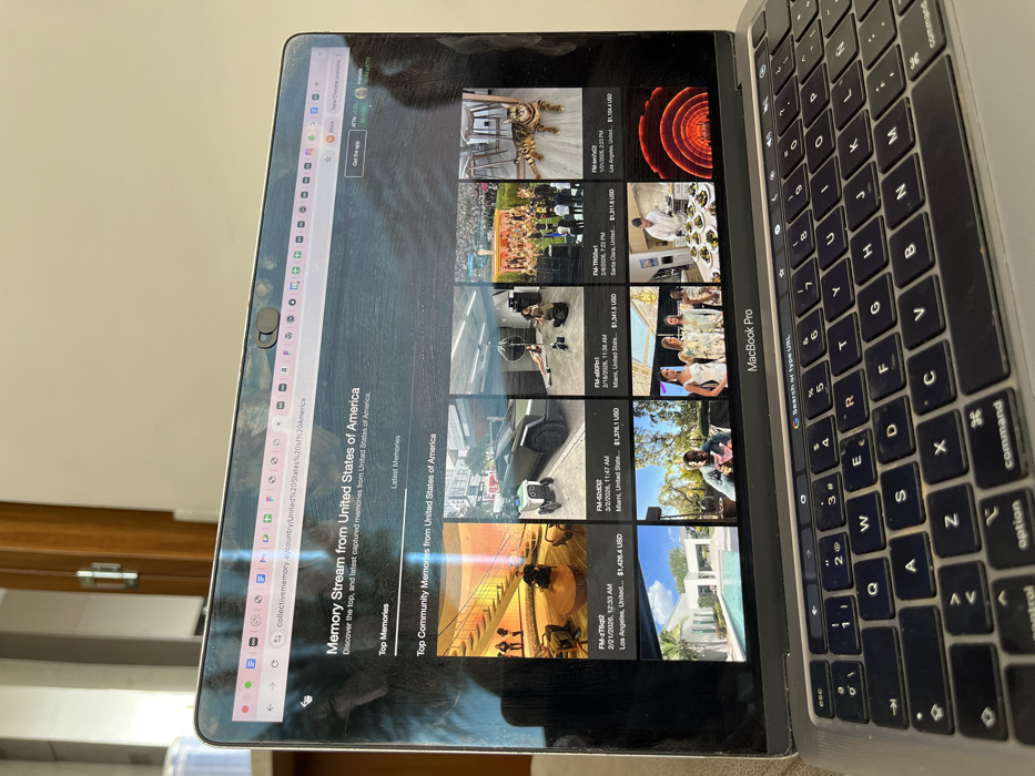 The image depicts an indoor scene in Santiago Yancuitlalpan, Mexico, focused on a silver Apple MacBook Pro laptop positioned on an unseen surface. The laptop screen displays a web browser (Google Chrome) open to "collectivememory.ai/country/United%20States%20of%20America," featuring a "Memory Stream from United States of America" webpage. This page presents a grid of various thumbnail images, each with a date, US location (e.g., Los Angeles, Miami, Santa Clara), and a corresponding USD value. Visible thumbnails include a modern interior with a curved staircase, a green Tesla Cybertruck with a delivery robot, an indoor workout space, a large gathering of people, a Bengal cat, a house with a swimming pool, a person holding a pink object, three women in light dresses, a chef plating food, and an abstract red tunnel. A black, oval-shaped sliding webcam cover is affixed over the laptop's integrated camera at the top center of the screen bezel. The screen itself shows significant smudges and reflections of the surrounding environment, including vertical lines from a light-colored wall and what appears to be a wooden doorframe or paneling in the background. The laptop's black QWERTY keyboard and "MacBook Pro" branding are visible in the foreground. No individuals are physically present or directly interacting with the laptop in the primary scene.