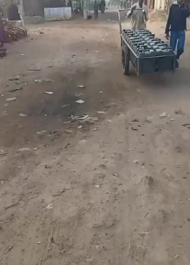two men moving a cart full of black containers along a dusty street in what appears to be a low-income neighborhood