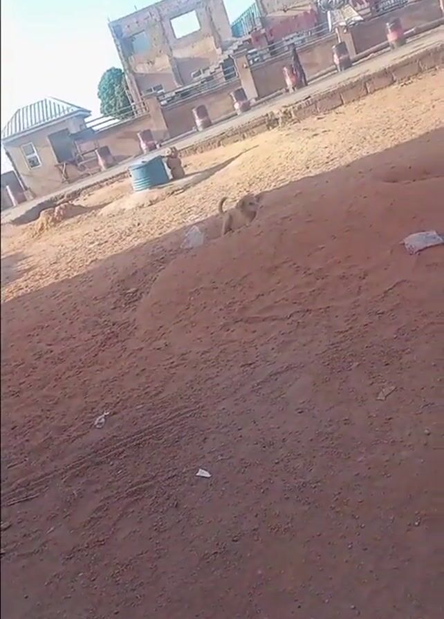 light brown puppy playing in a pile of reddish-brown dirt. The puppy wriggles into the dirt pile, sticks its head out, and then wriggles back in, its tail wagging. Behind the dirt pile, there is a road with some orange traffic barrels and a partially constructed building in the background. A man walks on the road. There is some trash scattered around the dirt pile. The weather appears sunny.