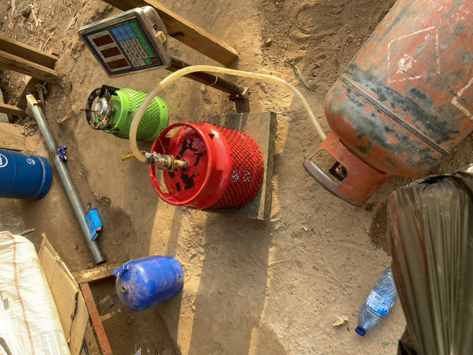 The image depicts a makeshift gas filling setup. Several gas cylinders in red, green, and blue are visible. A large, rusty cylinder leans against a black plastic bag. A digital scale is mounted above a green cylinder. A transparent hose connects the large rusty cylinder to a red one, which sits on a wooden block. The ground is sandy, and a discarded water bottle lies nearby, suggesting an informal or unregulated environment.