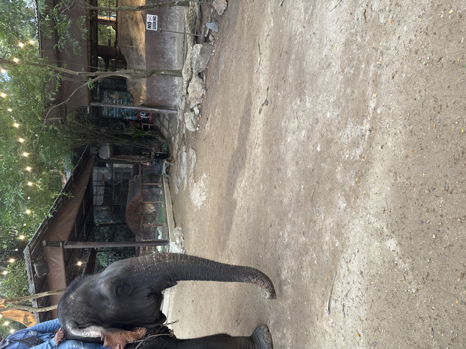 An outdoor scene in Muang Pattaya, Thailand, depicts an unpaved dirt path surrounded by buildings and vegetation. In the left foreground, a large, dark grey elephant stands facing right, its trunk curved towards the ground. A person, partially visible in a blue denim jacket, is seated on the elephant's back. In the background, a series of rustic structures with corrugated metal roofs are visible. One building on the left features a glass-fronted enclosure housing a light-colored animal, possibly a lion or large cat, resting inside a half-cylinder shaped shelter. To its right, another building displays a sign with "MONCHANA GIFT" and "10" visible. Further right, a "NO SMOKING" sign is affixed to a wooden post. Overhead, string lights with numerous bulbs are suspended between trees. The ground is light brown dirt with scattered pebbles and debris. Shadows are cast on the ground, indicating an external light source. Lush green foliage and tree trunks are present throughout the background.