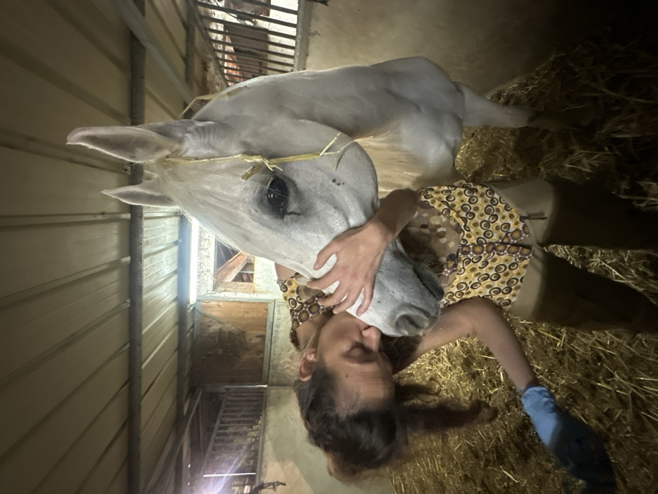 The image displays an interior view of an equine stable or barn. The floor is covered with a thick layer of dry hay. The ceiling is constructed from corrugated metal panels. A female individual is depicted with her head resting against the head of a white horse. She wears a sleeveless top featuring a yellow, brown, and white circular pattern, along with light brown or khaki trousers. A light blue disposable glove is present on her left hand, which extends downwards towards the hay-covered floor. Her right hand is positioned on the horse's muzzle. Her eyes are either closed or directed downwards. The horse is a large, white or light grey animal, standing on the hay. Strands of hay are visible within its mane. Its left eye is partially visible. Dark markings are present on its muzzle. The horse's head is angled downwards and towards the female. The background reveals wooden structures consistent with stall dividers. An opening or doorway, also featuring wooden elements, is visible further back. Artificial light sources illuminate the scene, resulting in moderate overall lighting. The specific location in the city of Unknown, Unknown, cannot be determined from the visual evidence.