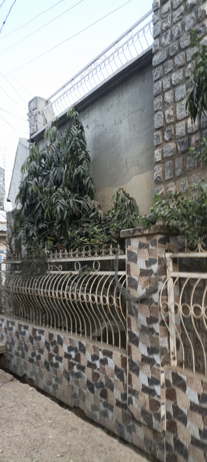 A stone and stucco building is partially concealed by foliage. A wrought iron fence with geometric patterns fronts the building, its base constructed with mosaic tiles of varying browns and grays. Above, a flat roof is adorned with a white, decorative railing. An adjacent structure features rough-cut stone blocks, adding textural contrast to the smooth stucco. The sky is a pale blue.