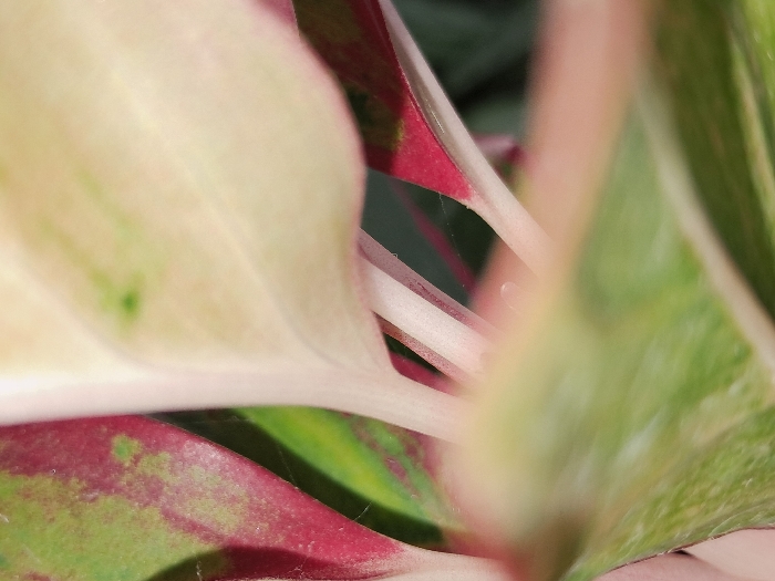 A close-up reveals the intricate patterns and textures of plant leaves. Creamy white, red, and green blend together, showcasing a vibrant mix of colors. Delicate, nearly invisible spiderwebs stretch between the leaves, adding a subtle layer of complexity. The light highlights the veins and subtle variations in color, creating a captivating macro view.