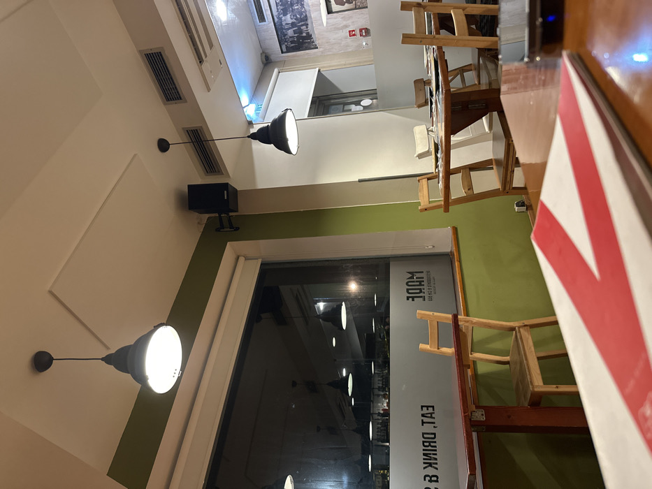 A brightly lit restaurant interior features rows of wooden tables and chairs. A large window showcases the reflection of hanging lights and the words "EAT, DRINK, BE". A black speaker is mounted on a white wall, near a prominent black light fixture. The interior design incorporates alternating sections of white and olive green paint. The perspective gives a slightly distorted view of the scene.