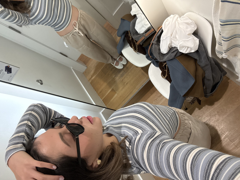 A woman takes a mirror selfie in a fitting room. She wears a blue and white striped long-sleeved shirt, tan pants, and white shoes. Her sunglasses perch atop her head, and she touches her hair. A white chair is cluttered with clothes including a denim jacket and a tan jacket. A striped shirt hangs to the side. The setting is an interior space with light-colored walls and wooden floors.