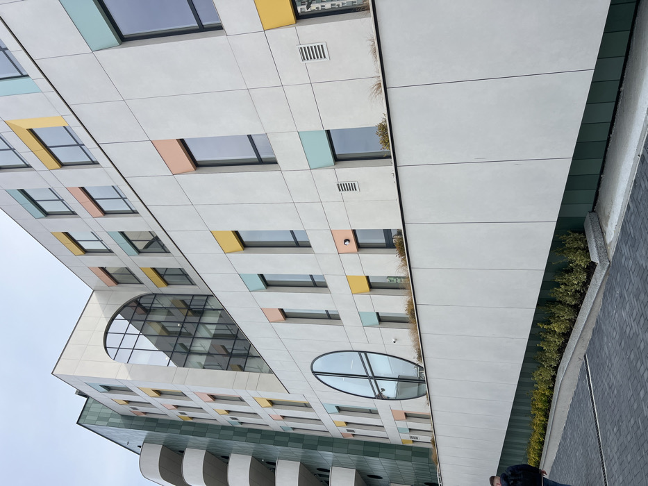 The image displays the exterior of a modern, multi-story building, identified as a new wing of the University Multiprofile Hospital for Active Treatment (UMBAL) Burgas, likely the Children's Ward, located at ul. 'Profesor Yakimov' 1, 8000 Burgas Center, Burgas, Bulgaria. The sky is overcast and grey. The building's primary facade consists of light grey paneling. Numerous rectangular windows are set into the facade, each framed by a brightly colored surround in pastel shades of yellow, light blue, or peach. A large, multi-pane arched glass window is prominent on an upper floor, reflecting parts of the sky and adjacent structures. Below it, on a lower floor, a significant oval-shaped glass window is visible. To the far left, an adjacent section of the building features multiple curvilinear balconies with white railings and a dark green, possibly tiled or paneled, facade. Below the main facade, a planter box runs horizontally, containing sparse, dry, light brown grasses. Beneath this, a light grey retaining wall slopes downwards to the right, bordered at its base by a strip of neatly maintained green shrubbery against a dark green paneling. The ground in the foreground is paved with dark grey interlocking bricks, also sloping downwards and to the right. One individual is visible on the far left, partially cropped, walking away from the viewer. This person is wearing a dark jacket or hoodie, dark pants, and a dark backpack. No interactions are depicted.