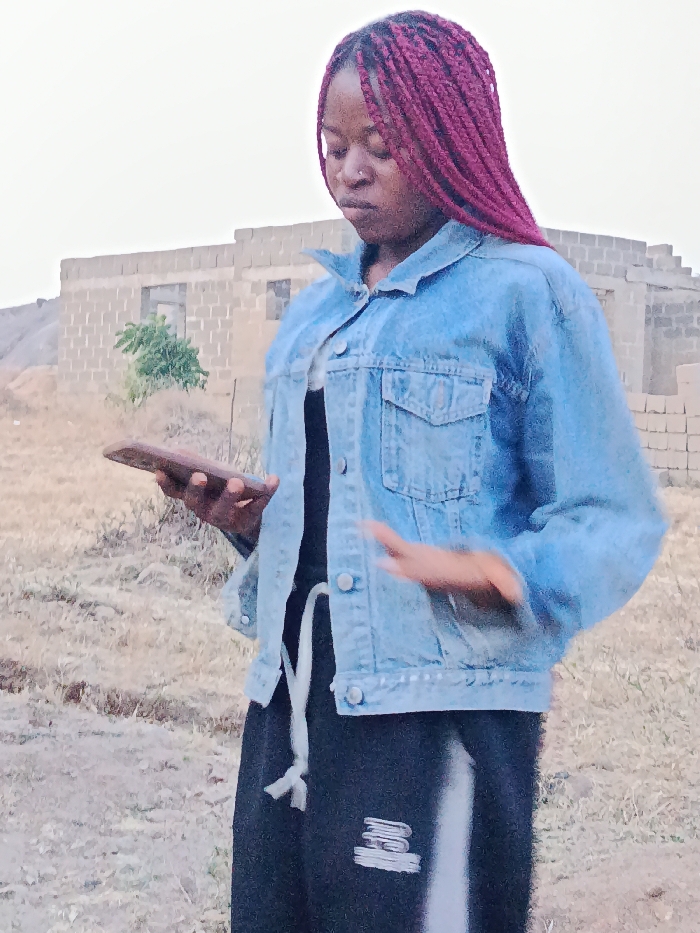 A woman with red braided hair wears a blue denim jacket over a black top and black sweatpants. She is holding a cell phone in her left hand and appears to be gesturing with her right hand. An unfinished brick building is visible in the background, along with sparse vegetation and an overcast sky. The scene is outdoors, and the lighting suggests it might be early morning or late afternoon.