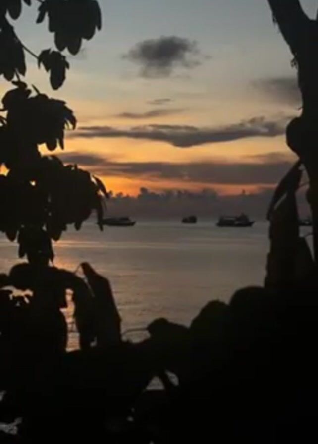 scenic view of the ocean at sunset. The sky is painted with hues of orange and yellow, with dark clouds scattered across. Several boats are visible on the water, silhouetted against the bright horizon. The scene is framed by the dark, leafy branches of trees in the foreground, adding depth to the image. There is a sense of tranquility and natural beauty in the scene.