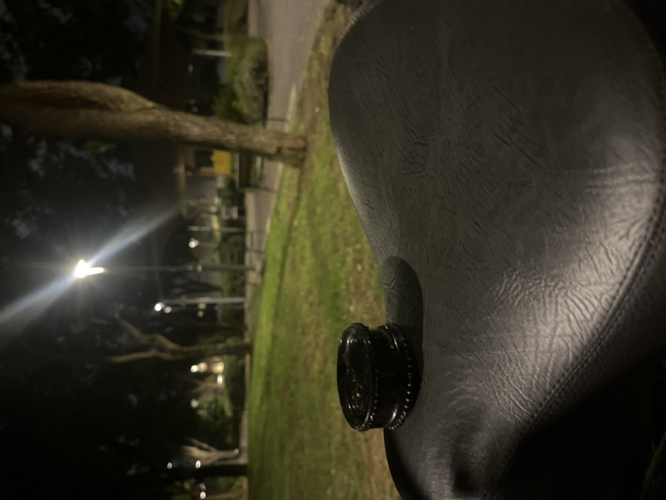 A black, cylindrical object, resembling a cannabis grinder and containing visible green plant material, rests on a dark, textured surface, likely synthetic leather, in the immediate foreground. The background, out of focus, reveals a public park at night, illuminated by several bright streetlights and park lamps that create strong light flares. The environment features grassy areas, numerous trees with dark foliage and visible trunks, and paved pathways. A small structure, possibly a kiosk or service building with a prominent yellow element, is faintly discernible in the far background. The scene is situated in **Gan Meir Park, Tel Aviv, Israel**. No individuals are present in the image.