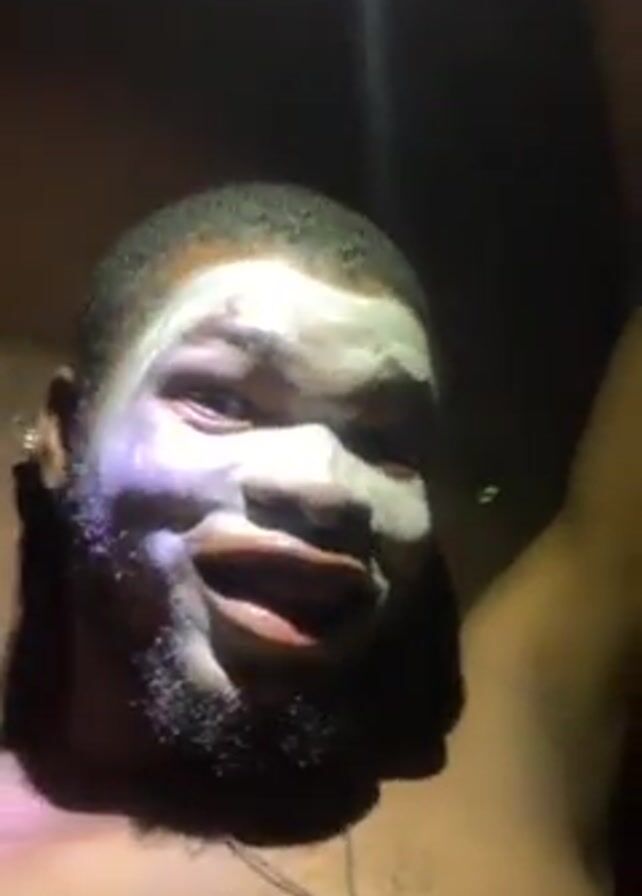 man with dark hair and a beard, wearing a white face mask, looking at the camera. Initially, the mask appears to have a purple tint, which appears to be from the lighting. He smiles, then opens his mouth wide and sticks out his tongue. He seems to be indoors in a dimly lit environment. He is shirtless and wearing a necklace.