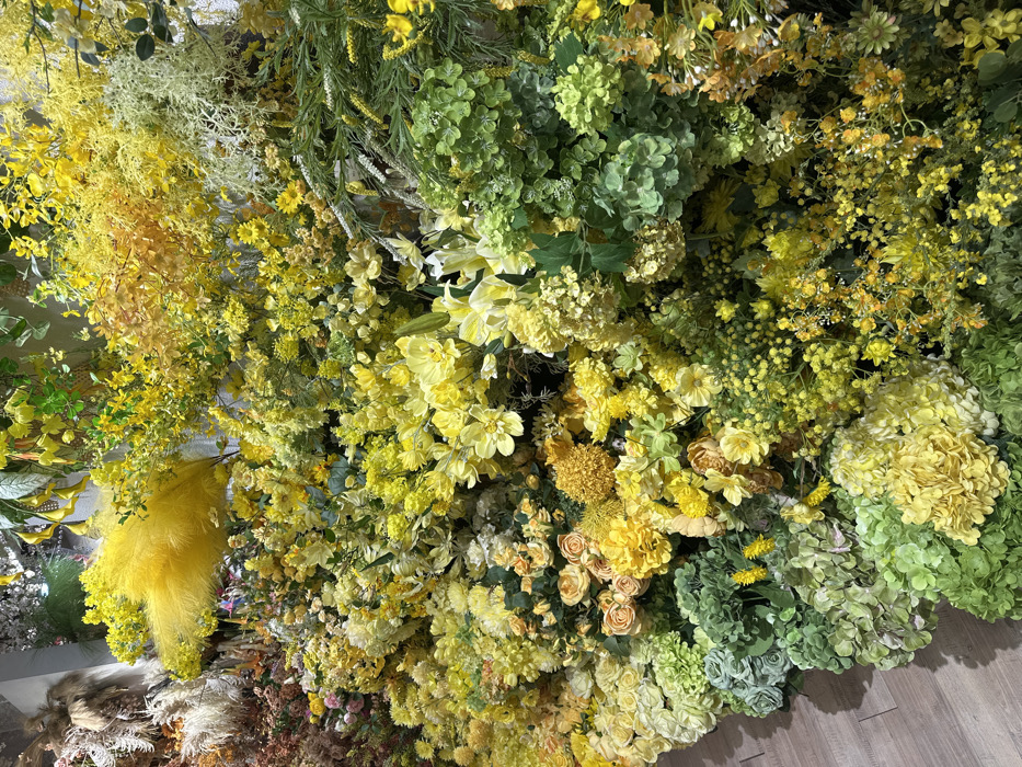 A dense arrangement of artificial flowers and greenery dominates the scene. Hues of yellow and green prevail, with accents of white and brown. Hydrangeas, lilies, and roses are evident, interspersed with feathery foliage. The composition features varying textures and depths, creating a layered, abundant effect. The background reveals a glimpse of the floor.