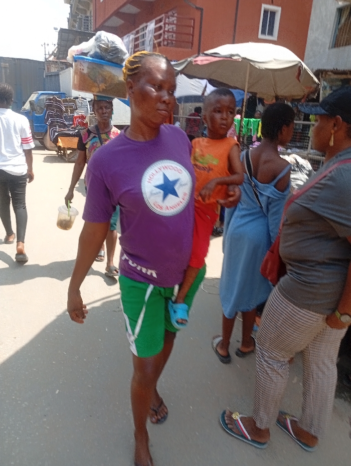 This image captures a bustling street scene in Onitsha, Nigeria. In the foreground, a woman with braided hair, wearing a purple t-shirt featuring a "Hollywood Los Angeles" logo and green shorts, walks forward while carrying a young child in an orange shirt and red shorts on her left hip. Behind her, another woman walks in the same direction, balancing a large clear plastic container topped with a white bag on her head and holding a smaller clear plastic container in her left hand. To the right, two women are partially visible, appearing to converse; one wears a light blue off-shoulder dress, and the other, seen from the back, wears a grey shirt, striped pants, and a dark cap. In the mid-ground left, a blue pickup truck loaded with what appear to be chairs or tables is parked. The background features market stalls with a large beige umbrella, set against multi-story buildings, one with a reddish-orange facade. The ground is paved, and strong sunlight casts distinct shadows.