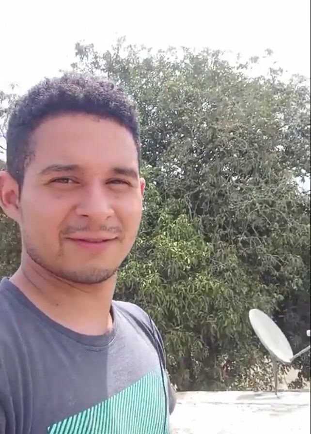 A man with short curly hair, wearing a gray shirt with green stripes and black earphones, stands on a rooftop and slowly rotates to his left, showing his surroundings. Behind him is a tree, a satellite dish, a fenced-in area with equipment, and a distant field with scattered trees. The sky is partly cloudy.