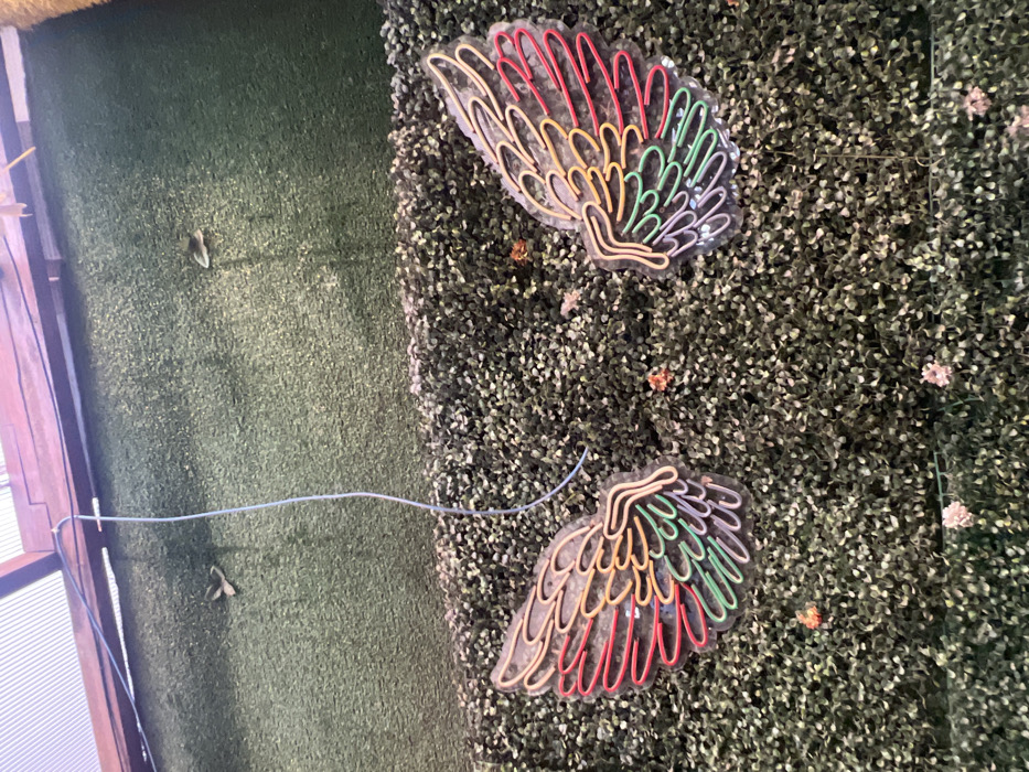 The scene depicts a vertical green wall composed of artificial foliage, likely situated within a commercial establishment in Ikeja, Nigeria. Mounted on this wall are two illuminated, neon-style wing decorations, positioned with a gap between them. Each wing features a outline in clear tubing containing multiple colored sections: red at the outer top, followed by orange/yellow, green, and a blue/grey section towards the bottom inner curve. A thin blue electrical cable descends from the top center of the frame, passing over the foliage wall between the two wings. Small, scattered artificial floral elements in faded orange/brown and light pink are embedded within the green foliage, particularly noticeable in the lower half of the image. The top edge of the image reveals a partial view of a brown wooden beam structure and a translucent, corrugated roof panel, suggesting an overhead covering. No individuals are visible. The environment presents a static, decorative display.