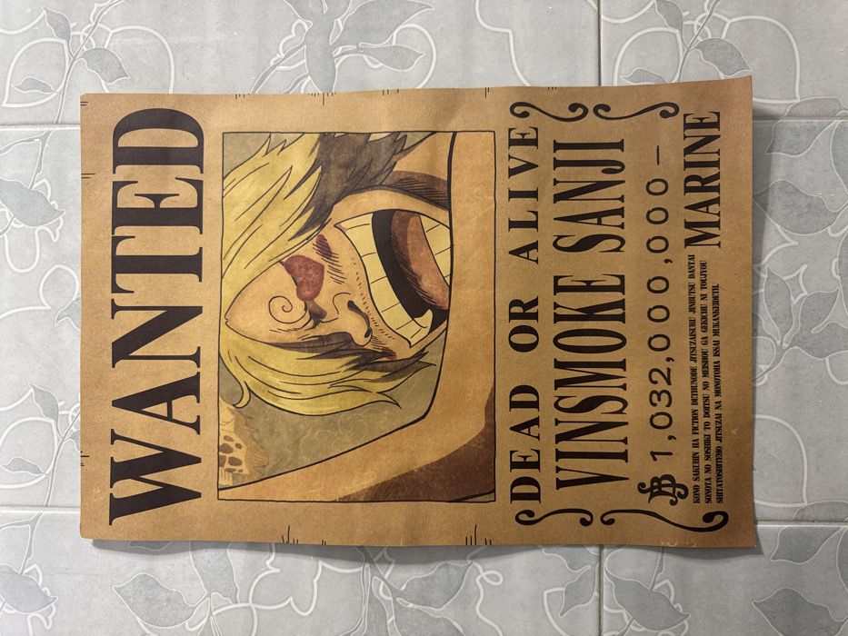 A "WANTED" poster displays an illustration of Sanji from One Piece, identified as "VINSMOKE SANJI"