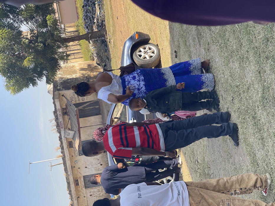 The image depicts an outdoor daytime scene in Zaria, Nigeria, focusing on a group of individuals gathered in an open, unpaved area with sparse dry grass and dirt patches. The background features a dilapidated, light-colored single-story building with visible cracks and handwritten markings, including numbers such as "0912" and "0911." A small corrugated metal awning projects from one section of the building. Overhead, a tall, thin light pole with a luminaire and power lines are visible against a clear blue sky. To the right of the building, a green-leafed tree stands next to a visible accumulation of refuse and debris. In the midground, a dark-colored sedan, likely blue or black, is parked on what appears to be a dirt track in front of the building, with its passenger side and front wheel partially visible. Several individuals are present. From left to right: 1. The partial back view of a person wearing a white t-shirt with "Pearl James" and "Niwumanangh Naha" printed on it, and brown trousers. 2. A male figure, seen from behind, wearing a red and black horizontally striped t-shirt, dark trousers, and a silver-colored bracelet or watch on his left wrist. 3. Partially obscured near the parked sedan is an adult male in a dark, possibly traditional, collared garment. 4. A young child, approximately 3-5 years old, wearing a dark green or black jacket and dark trousers, is positioned centrally, looking directly at the camera with a small, light-colored object held in their right hand. 5. Standing behind and slightly to the right of the child is an adult female, seen from behind, wearing a white short-sleeved top with lace-like detailing on the back and a long, ornate blue skirt with white embroidered patterns at the hem. Her hair is styled in an updo, and she carries a brown shoulder bag on her left side. Her bare feet are visible. 6. A person in a patterned garment is partially visible behind the female and child. 7. In the extreme right foreground, a blurry, out-of-focus purple garment is visible, suggesting another person close to the camera. The scene conveys a casual gathering of people in a semi-urban setting, with no overt actions or interactions clearly discernible beyond their presence in the same area.