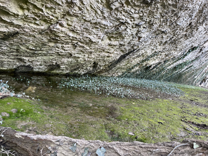 The image displays the interior of a natural rock overhang or shallow cave structure located in Petrevene, Bulgaria. The dominant feature is a horizontally stratified rock ceiling, appearing light grey to brownish, characterized by rough, layered textures and visible fissures. Beneath this overhang, the ground is largely covered by vibrant green moss and dark, moist earth, interspersed with areas of standing water. Dense growths of small, light green, vine-like leaves, consistent with ivy, are clustered along the base of the rock wall and across parts of the ground. On the far right, darker green vegetation adheres to a sloped rock face, which also exhibits several small, dark, circular hollows or indentations. A prominent, rough-barked tree trunk or log with attached ivy leaves lies horizontally across the lower foreground of the frame. No individuals, animals, or signs of human activity are present.