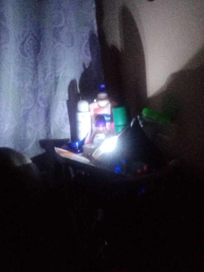 The scene depicts a dimly lit indoor environment in the city of Unknown, Unknown. The primary light source is a single, bright artificial illumination emanating from a small device situated on a flat surface in the mid-ground, creating significant glare. To the left, a light-colored curtain with a subtle ornamental pattern is visible. A dark wall occupies the right side of the frame, displaying large, indistinct shadows consistent with objects on the illuminated surface. On the surface, several items are arranged: a white cylindrical bottle, a taller clear or light-colored bottle, a smaller bottle with a purple cap, and a green cylindrical container. A small blue cup or container is positioned next to the white bottle. Below these items, a flat, light-colored object is partially visible. The foreground and lower portions of the image are obscured by darkness. No individuals are present in the frame.