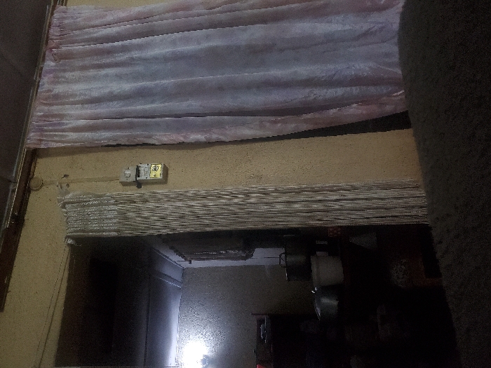 A room with a light source shining through the doorway. A wrinkled pink curtain hangs at the top of the image. Underneath, a light switch is attached to a tan wall. Below the switch, a stack of horizontal blinds are visible. The background is blurry, but contains pots and pans and other items, likely in a kitchen. The picture is rotated slightly, and there is a large dark object on the right.
