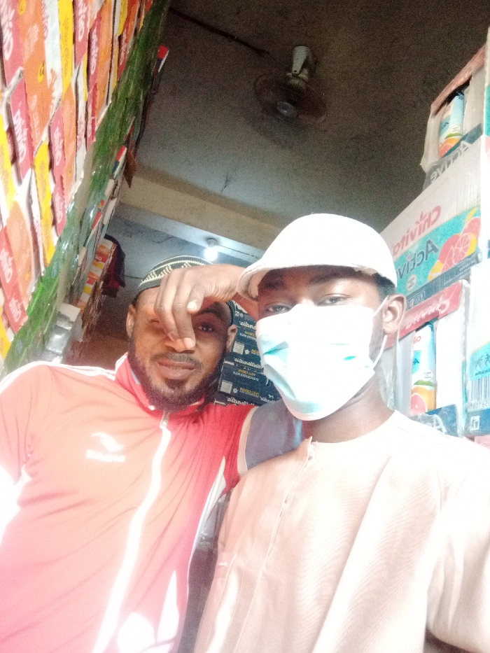 A selfie-style photograph captures two adult males within an indoor commercial or storage environment. The male on the left, featuring a beard and a dark-patterned kufi, wears a red full-zip tracksuit with white shoulder stripes, his left hand partially obscuring his lower face as he looks towards the camera. The male on the right wears a white cap, a light blue surgical face mask covering his nose and mouth, and a light-colored tunic, with his right arm resting on the left male's shoulder. The background includes a wall covered in various small, colorful, rectangular product packaging on the left, and stacked cardboard boxes on the right, one of which is labeled "Chi VitActiv" with citrus imagery. An old, dusty ceiling fan is visible mounted on the ceiling. Strong illumination from the front-left casts glare across the scene. A specific location within Fagge C, Nigeria, is not visually identified.