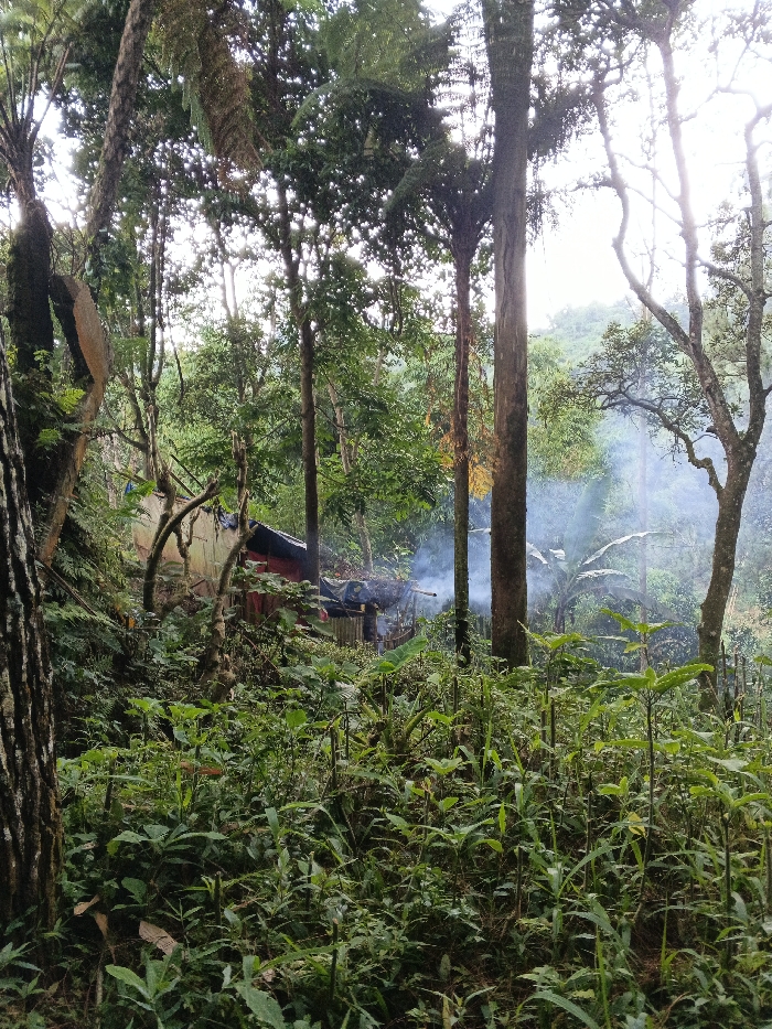 Lush green foliage fills the foreground, leading into a densely wooded area. Tall, thin trees reach skyward, framing a glimpse of a makeshift structure with a red roof nestled amongst the trees. Wisps of smoke rise into the air, suggesting a fire or cooking activity. The overall impression is one of a secluded dwelling within a vibrant, natural environment.