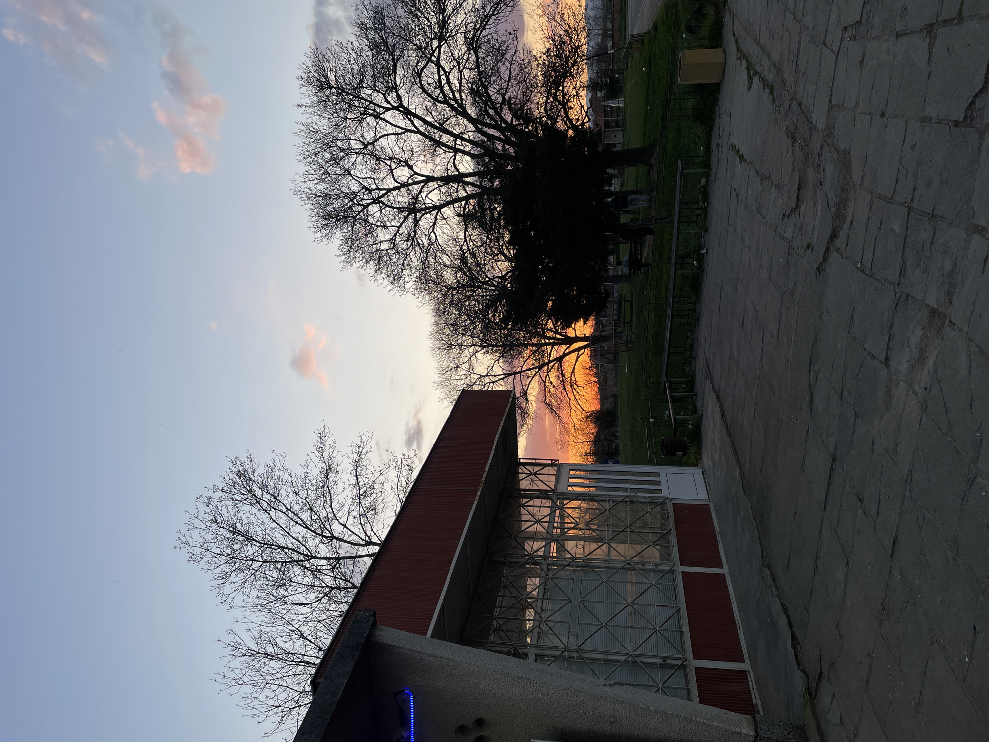 The image depicts a twilight scene, likely in Dolna Mahala, Bulgaria. A portion of a building with a red corrugated metal roof is visible in the foreground. The building features a large, multi-paned window with a diamond-shaped lattice. A tree with bare branches is situated near the building. In the background, a large tree with dense branches is silhouetted against an orange-tinged sky. Beyond the tree, there is a grassy area with what appears to be a paved walkway or road. The sky displays a gradient of colors, transitioning from pale blue to orange and pink near the horizon.