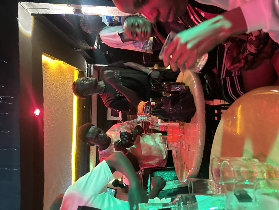 A group of people are gathered around a round table in a bar or club. Shot glasses and bottles are on the table. The patrons are wearing casual clothing. The lighting in the bar includes neon lights and a red light. Several of the bar's patrons are standing and talking.