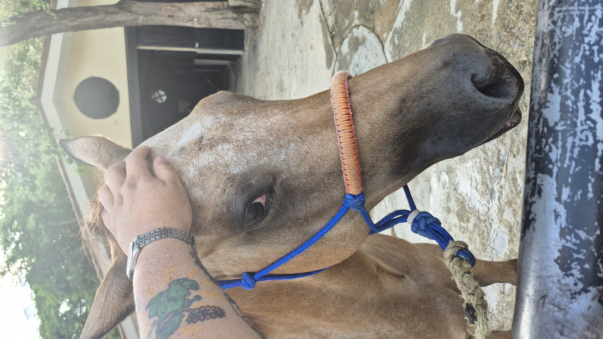 A close-up shot, taken outdoors in daylight, shows the head and upper body of a light brown horse with a darker muzzle. A person's hand rests on the horse's head, visible with a silver wristwatch and a tattoo of a green parrot on their arm. The horse is wearing a bridle with an orange rope around its neck and a blue rope under its head. The background includes a building with a round window, a tree, and what appears to be a concrete surface. A striped pole is visible on the right side of the frame. The location is not discernible from the image and cannot be conclusively identified as Valencia, Venezuela.
