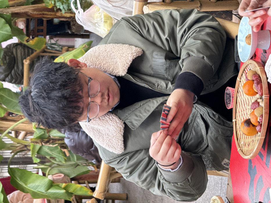 The image depicts an East Asian male seated at a table in an outdoor or semi-outdoor eatery located in Yuzhong District, Chongqing, China. The man, possessing dark, curly hair and wearing glasses, an olive green bomber jacket with a cream fleece collar, and a dark sweater over a light collared shirt, is centered in the frame. His gaze is directed downward, focused on a small stack of red, blue, and white striped cards held in both hands, which he appears to be manipulating. On the red patterned tablecloth in front of him, a round bamboo woven tray holds several items: three small oranges (one with a dark spot), multiple reddish-brown dried jujubes or dates, and several light brown, oval-shaped longans, intermingled with small pale nuts. To the left of the tray, a small pink glass cup is visible. To the right, a light blue pedestal dish contains a single spherical light brown item. A human hand is partially visible on the far right, near the blue dish. The background features lush green banana-like foliage and bamboo structural elements, consistent with traditional Chinese outdoor dining or tea house settings. Blurred figures and a translucent plastic bag with contents are also discernible in the soft-focus background.